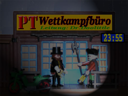 Meanwhile am PT-Wettkampfbüro. Der Securitymitarbeiter dreht schon seine dritte Runde. "Na, Doc? Ist mal langsam Zeit für Feierabend, oder?" Dr. Doolittle zückt seinen Schlüsselbund, schliesst gemächlich die Tür ab und gähnt herzhaft. "Jau, jetzt hat sich seit Tagen niemand mehr für das W.A.R. angemeldet, wird wohl auch keiner mehr kommen. Da kann ich auch nach Hause gehen. Gute Nacht!" Der Nachtwächter kichert. "Ja dann, gute Nacht, Doc! Das kann ich jetzt übrigens auch auf Goldfischisch. Hören Sie mal..."
