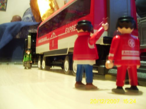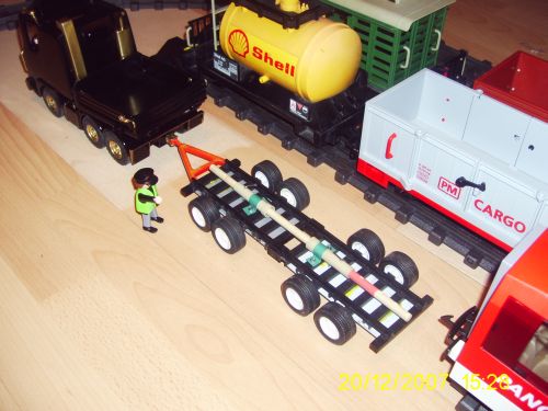 Der Culemeyer ist für 40 Tonnen ausgelegt und läßt sich von 28 cm bis 42 cm ausziehen, so daß auch größere Fahrzeuge, wie z.B. Krokodil transportiert werden könnten. Der Wagen besteht aus einer Dickie-Schiene, die die selbe Spurbreite wie Playmobil hat. In die Schweller habe ich Achsen vom alten Krankenwagen eingesetzt. Die Schiene wurde verkehrt herum wieder zusammengefügt, so daß die Endstücke in der Mitte wieder zusammenkamen und wieder eine Schiene ergaben. Dadurch läßt sich der Wagen in der Mitte teilen und ausziehen. Damit der Wagen im ausgezogenen Zustand Halt hat, habe ich zwei Kanalrohre in die Mitte gelegt, dadurch eine Holzstange geführt die durch die Bolzen auf verschiedenen Längen gesichert werden kann. Dadurch ist der Wagen universell an verschiedene Wagon- oder Lokgrößen anpassbar. Die Bilder zeigen das Anliefern des Wagon mit anschließendem Abrollen aufs Gleis. Hierzu muß ein Teil des Gleises lediglich um 8 mm angehoben werden, so daß der Wagen bündig davorfahren kann.