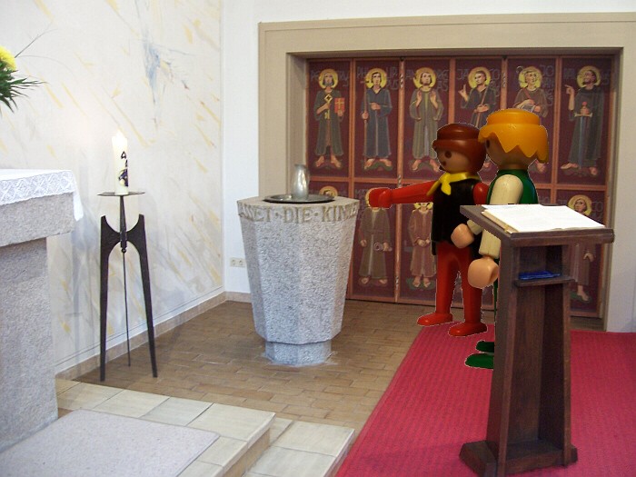 „Und das ist der Raum, in dem die Gemeinschaft der Kirchengemeinde stattfindet. Der Stein der Weisheit ist der Taufstein. Jeder Taufstein, weil er durch die Taufe einen Menschen in die Gemeinschaft der Kirche bringt. Die Gemeinschaft, die dann in den Gemeinden gelebt wird, zum Beispiel beim Kaffeetriken nach dem Gottesdienst...“