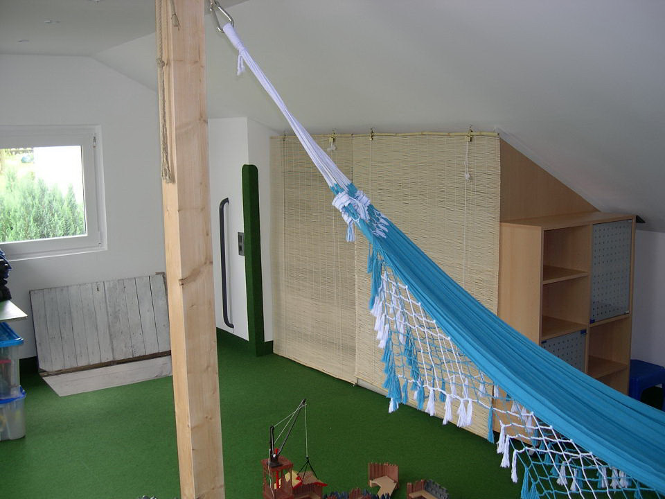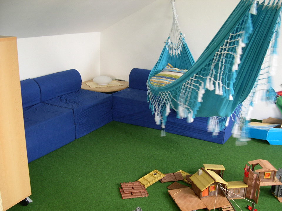 Die Sitzecke. Tim versteckt sich in der Hängematte. Eigentlich hat hier noch nie jemand gesessen, aber die Kinder lieben es hier zu Toben und Buden zu bauen.