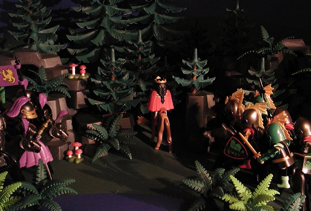 Als sie am See ankam war das Wasser ungewöhnlich grün. Hier musste etwas Schreckliches passiert sein. Die Brücke zur Heilquelle in der Mitte des Sees war auch zerstört. Es ragten nur noch vereinzelte Felsbrocken aus dem Wasser heraus. Auch ihr Pferd Isidor wollte kein Wasser vom See trinken, wie es das sonst immer gerne tat, denn das Wasser des Sees schmeckte furchtbar salzig. Da tauchten auf der anderen Seite des Sees gefährliche Drachenritter aus dem Wald auf. Als Elena merkte, dass sie entdeckt worden war, sprang sie schnell auf ihr Pferd und flüchtete am Ufer entlang. Die bösen Ritter folgten ihr. Als dann vor ihr auch noch Schwarze Ritter auftauchten, ritt sie eine scharfe Kurve und bog in den Wald. Sie ritt so schnell ihr Pferd laufen konnte.