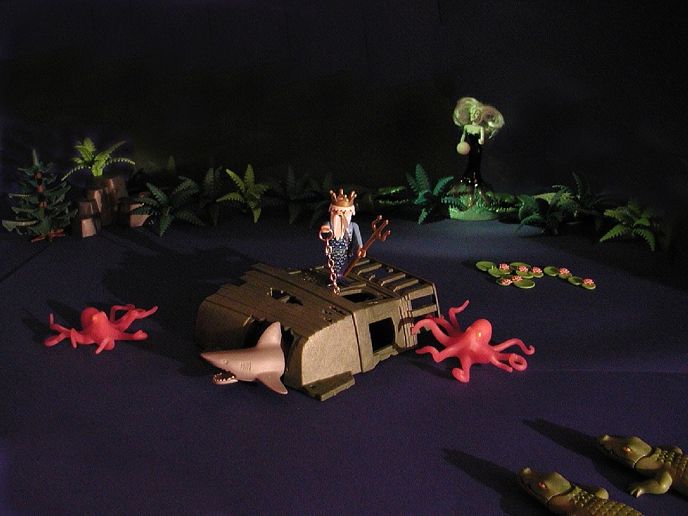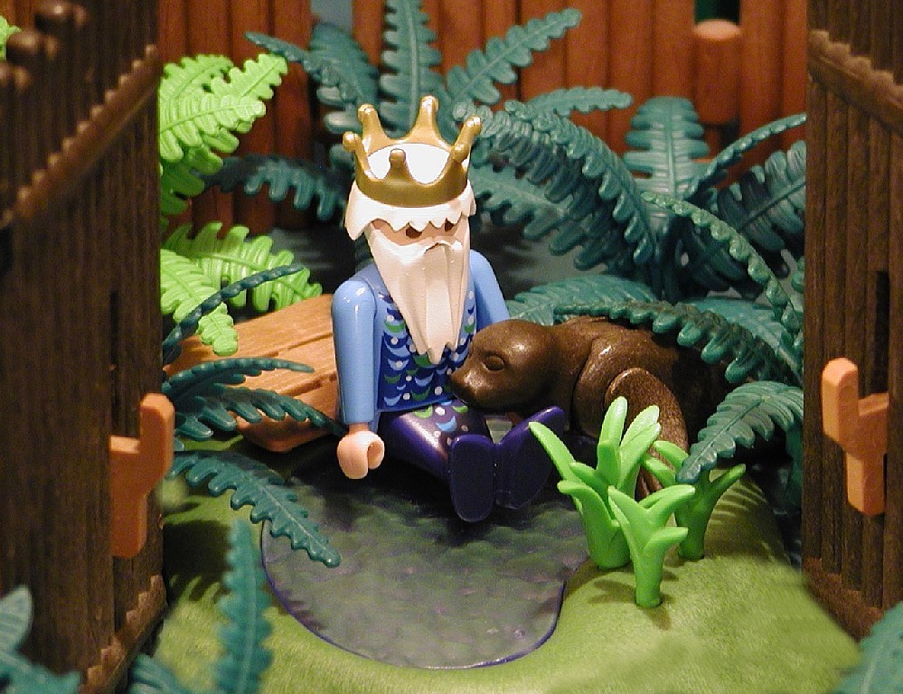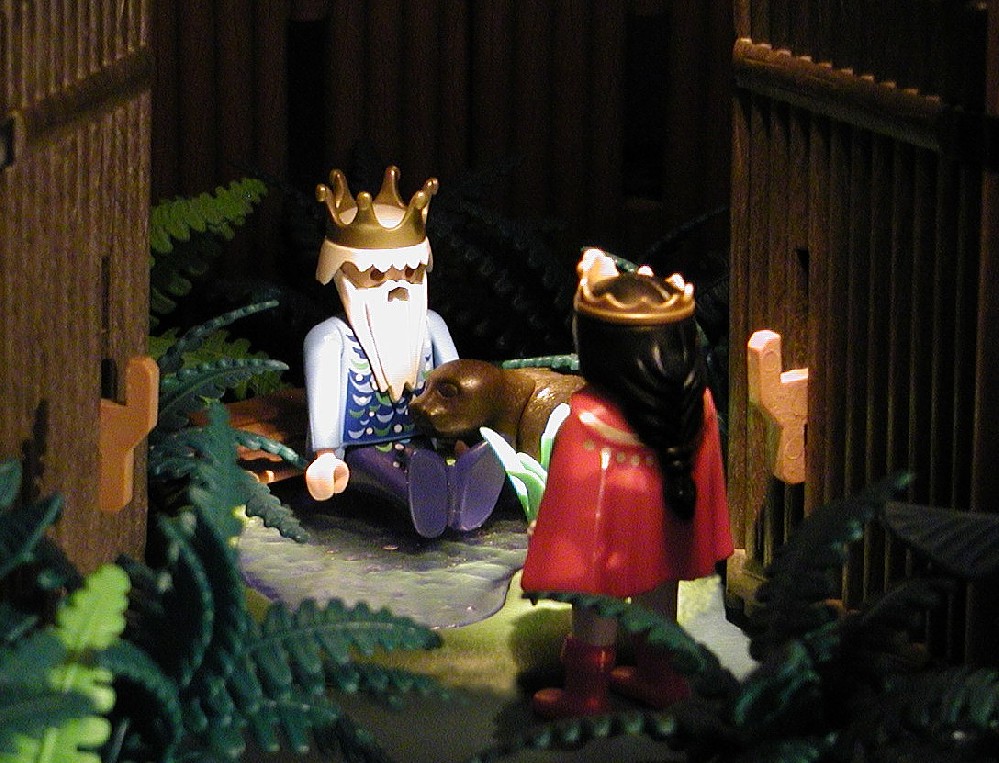 Und was sah sie dann? Den Seekönig, der in einer Pfütze seiner eigenen Tränen gerade noch am Leben war. Die Seehexe hatte sich seines Sees bemächtigt. Hinterrücks war er überfallen und hierher gebracht worden. Völlig entkräftet drohte er auszutrocknen. Nur mit dem Heilwasser aus der Quelle in der Mitte des Sees, konnte er gerettet werden.