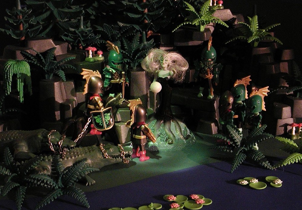 Sogleich schlich Elena zum See zurück. Doch zur Quelle zu kommen, war gar nicht einfach. Haifische schwammen im See herum, so dass niemand hinüber schwimmen konnte. Man sah auch Kraken um das Wrack eines Bootes im Wasser kreisen. Wahrscheinlich hatten sie es in die Tiefe gezogen und zerstört. Auf der anderen Seite konnte Ritterlinchen beobachten, wie Drachenritter der Seehexe hungrige Krokodile brachten, um den See noch unbezwingbarer zu machen.