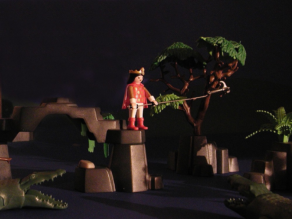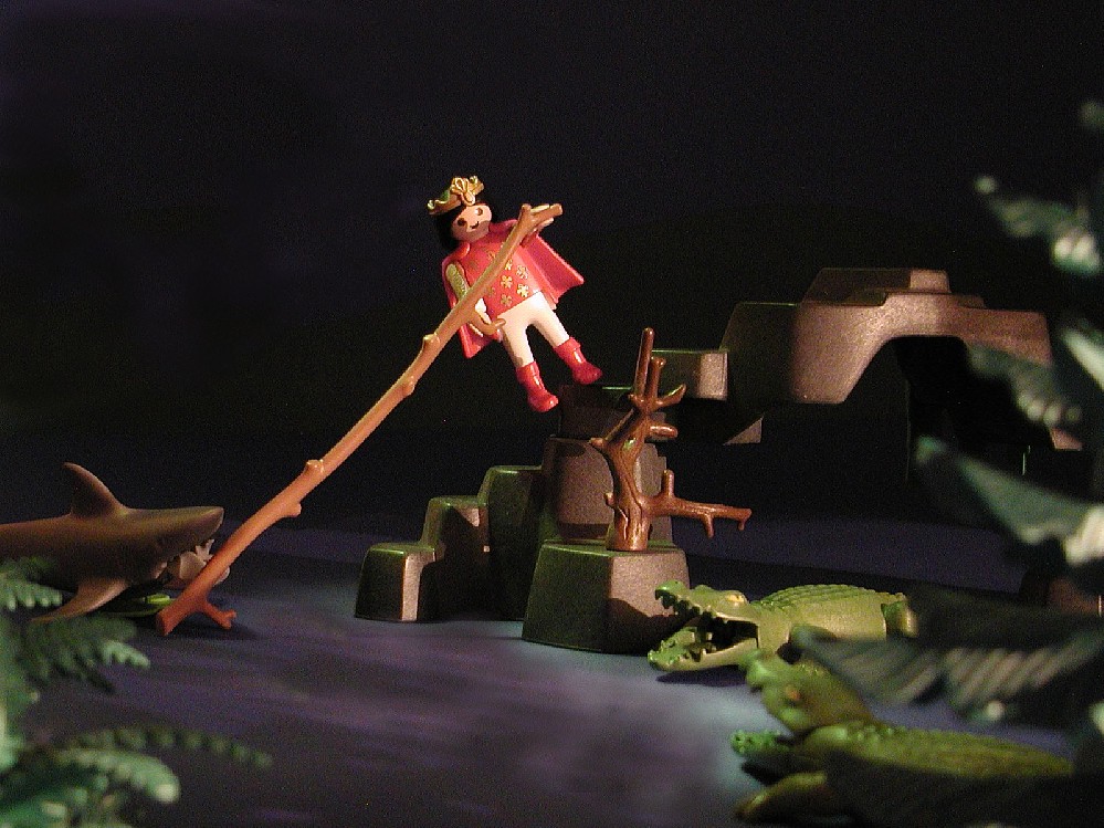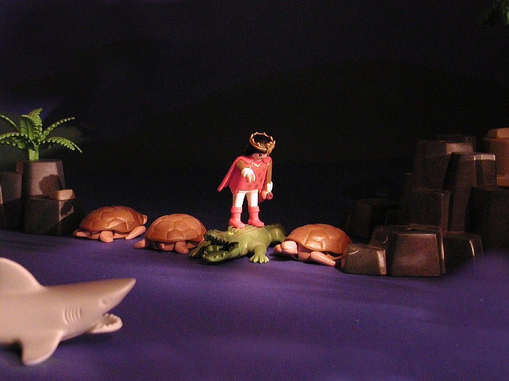 Den letzten Rest wollte sie eigentlich schwimmen. Doch die Krokodile hatten gemerkt, was Ritterlinchen vor hatte. Sie versperrten ihr den Weg. Da tauchten die Schildkröten auf, denen sie geholfen hatte, und animierten Ritterlinchen auf ihre Rücken zu springen. Den lieben Tieren konnten die Raubtiere dank ihres Panzers nichts anhaben. Die Prinzessin nahm Anlauf sprang auf die erste und zweite Schildkröte und dann noch ganz frech über den Rücken eines Krokodils zur dritten Schildkröte.