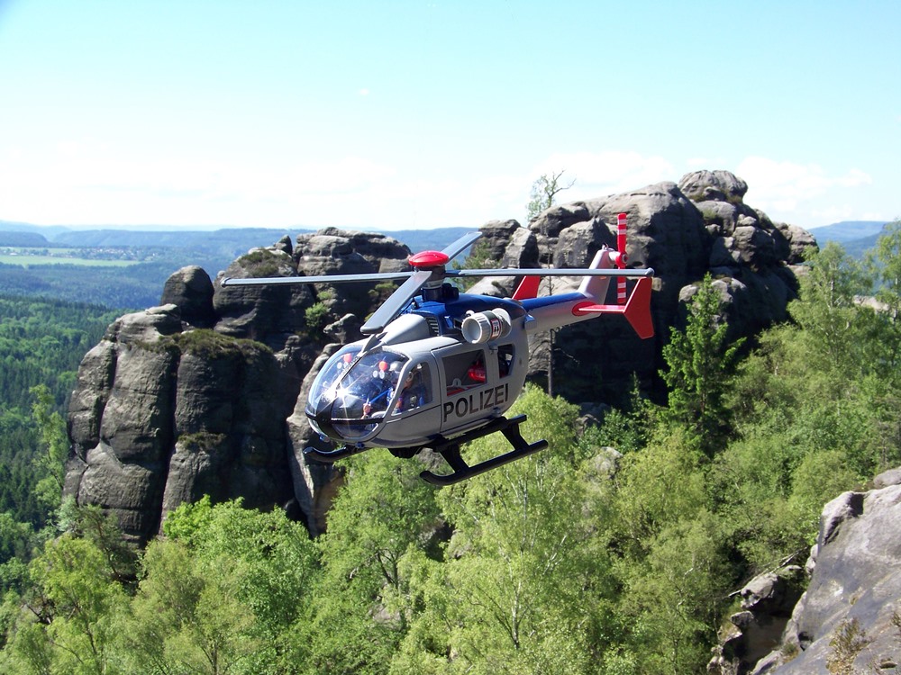Der Polizeihubschrauber der Sächsischen Polizei "D-HSNE" ist auf dem Flug zu einem Einsatz in der sächsischen Schweiz. Bei der Windenrettung muss der Abwind der Rotoren beachtet werden!