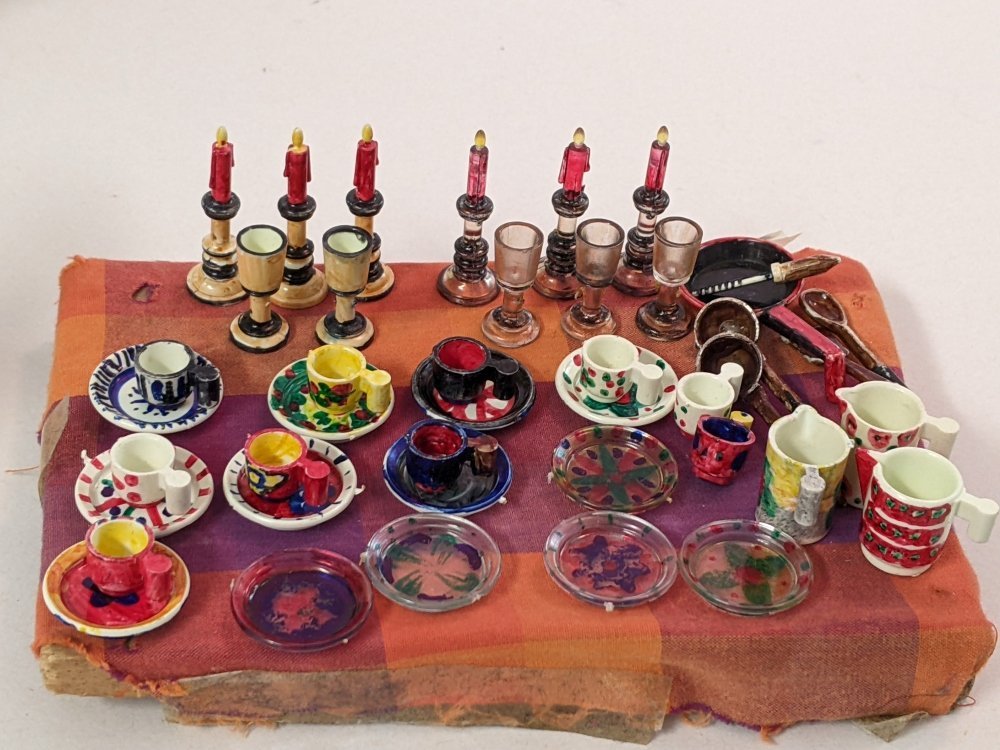 Auch den Holztisch dazu mit der Tischdecke, habe ich immer noch.
