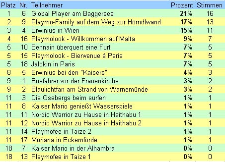 hier ist das Wahlergebnis aus unserem Wettbwerb "Mein Avatar im Urlaub"!