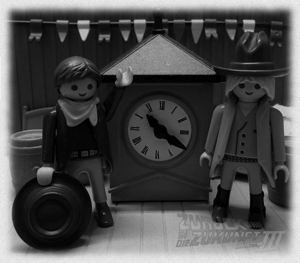 Mein Bild zeigt Marty ähhh Clint Eastwood und Doc Brown beim Erinnerungsfoto vor der neuen Rathausuhr.