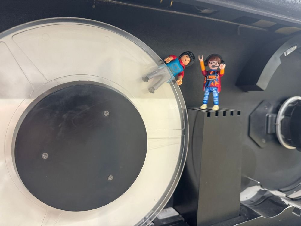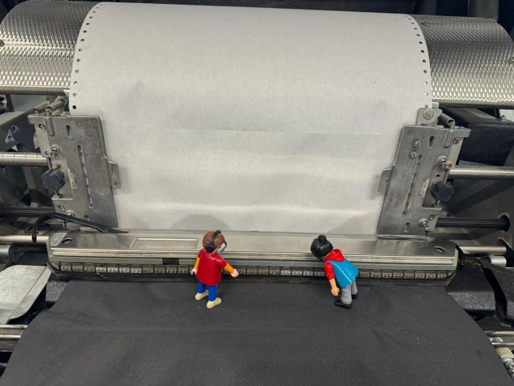 „Ein Kettendrucker von 1974. Er schreibt 3500 Zeilen pro Minute. Aber nicht von links nach rechts, sondern immer dort, wo ein Buchstabe auf der rasenden Kette an der richtigen Stelle auftaucht, wird er gedruckt.“