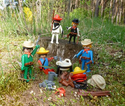 Diese Figuren sind nicht mehr die, die ich in meiner Kindheit hatte, entsprechen ihnen aber genau. Abweichend von der Beschreibung und Darstellung in der Datenbank (siehe http://www.klickywelt.de/viewtopic.php? ... 41#p651346) war mein mexikanischer Bandit weiß, nicht gelb. Der grüne Cowboy hatte schwarze Haare, keine blonden. Statt 3 roten und 2 blauen Halstüchern lagen meinem Set 5 rote Halstücher bei. Und es enthielt insgesamt 3 rote und 2 gelbe Sombreros, nicht 3 gelbe und 2 rote.