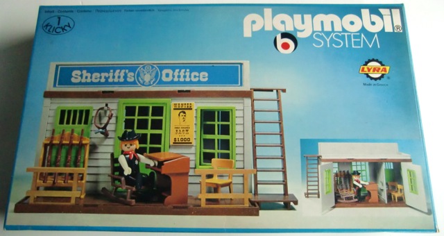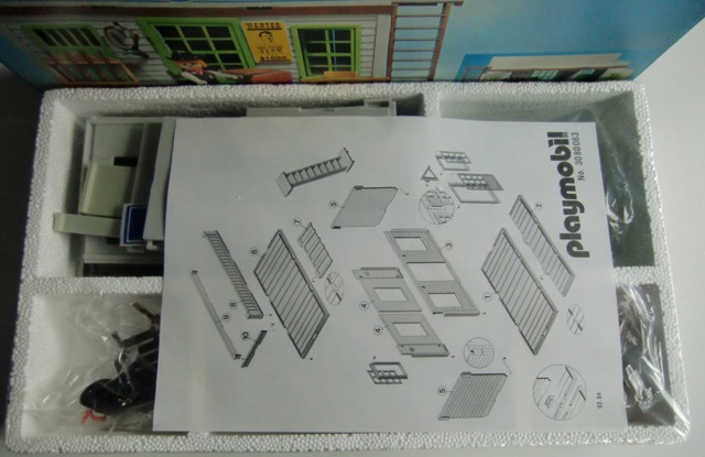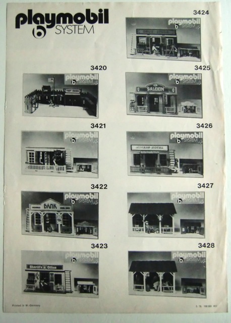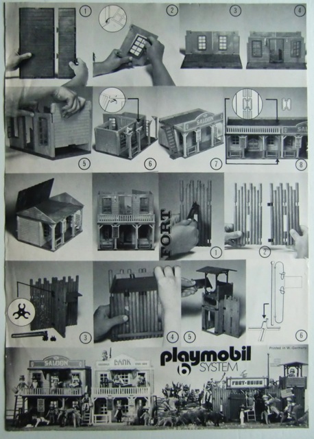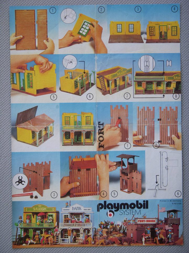 Ich habe alle meine eingeschweisste V1 Western Häuser kontroliert und alle haben die farbliche Bauanleitung (Faltblatt) und die kleine Flyer aus 1976 (mit Western Planwagen auf der Vorderseite). Das älteste Playmobil Dokument (2 Seiten) was ich habe ist diese hier in schwarz/weiss (ist original, kein Kopie). Auch die Lyra Variante hat das Bauplan von den 3423 V2, aber mit einem Datum "02-84".