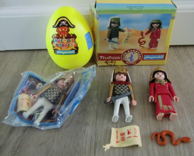 Gestern konnte ich die ganz seltene Ägypter Telepizza Set zufügen an meiner Sammlung, jetzt fehlt mir nur noch das Gespenst aus 2002. Mir ist noch aufgefallen das der Ägypter aus dem Spanischen Ei eine andere Farbe vom Kragen hat (rot). Das weisse Kopftuch gab es glaub ich nur in diese beide Sets. Die Telepizza Promotion gab es vom 1999 bis 2002. Der erste Verpackung (Jungle Explorers) sieht man noch recht oft, die andere Verpackungen sind schwieriger zu finden.