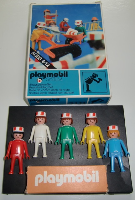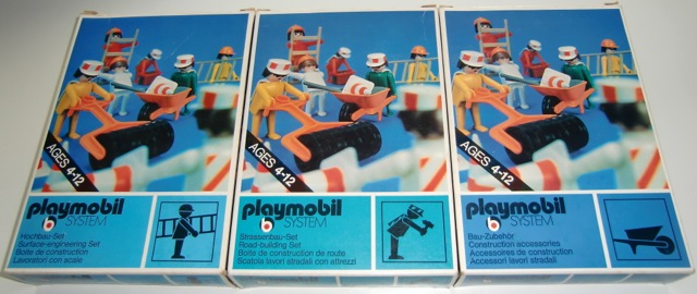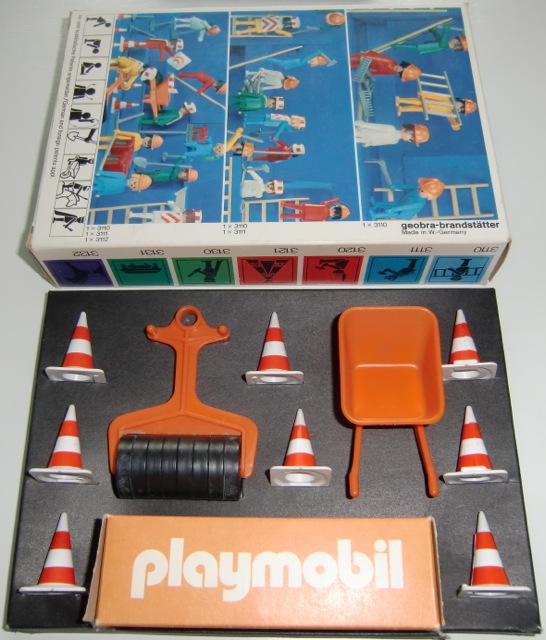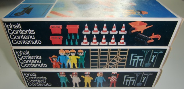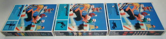 Die erste 3 Bau Sets aus 1974 mit schwarzer Pappkarton (sehr selten) und orange Zubehör Boxen und alle original erste Generation (mit Loch) Figuren. OVPs und Inhalt sind in Top Zustand. Ich habe nie gedacht das ich diese Sets noch je finden sollte mit schwarzen Pappkarton. Schon in 1974 wurden diese schwarze Pappkartons schon ersetzt mit diese weisse Schalen aus Kunststoff. Ich bin als Sammler super glücklich mit diese 3 Sets (3110, 3111 und 3112).