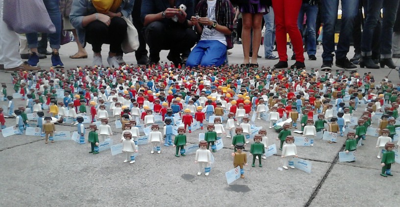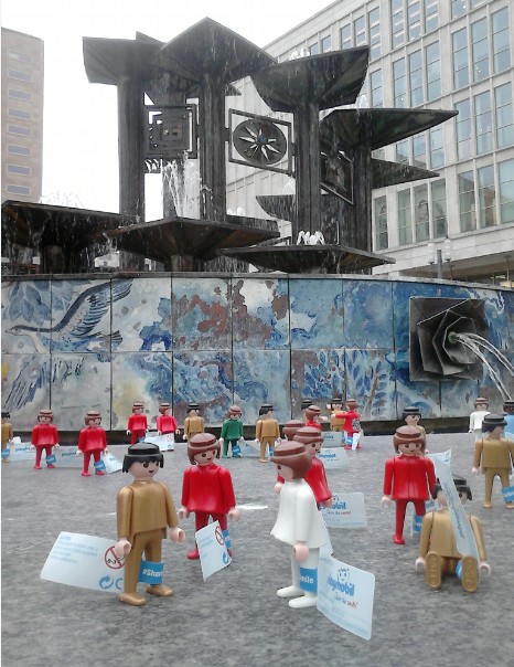 An einer der Beton-reichsten und für meine Begriffe unwirtlichsten Stellen Berlins, am Alex hat heute eine kleine Schar von 5000 Playmos versucht, ein Lächeln in die Welt zu zaubern. Der Platz um den Brunnen der Völkerfreundschaft war gut gewählt, fand die Aktion doch zeitgleich in Warschau, Amsterdam, Paris, Madrid, Athen, Princeton (USA) und Mexico City statt.Insgesamt 40000 Figuren (leider teilweise mit dem bekannten Rückenleiden - siehe Bild) sind weltweit angetreten- am Bein einen Zettel und auf dem Rücken einen QR-code.
