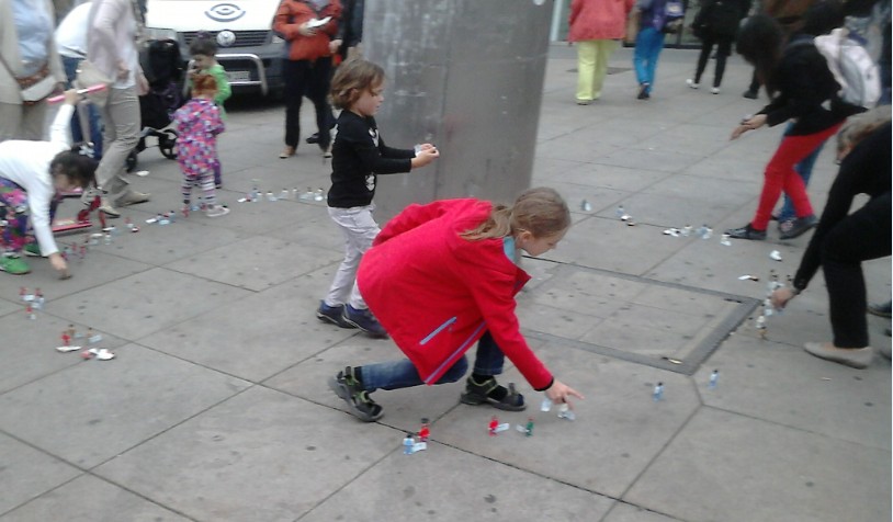 ...es waren mehrere Grüppchen aufgestellt, die viele Schaulustige in ihren Bann zogen. Lustigerweise standen die meisten davor und trauten sich nichtmal die Figuren anzufassen, geschweige denn mitzunehmen. Erst wenn jemand den ersten Schritt machte, schmolz das Eis. Es waren naturgemäß viele Touristen dabei, die so die Figuren wohl noch weiter um die Welt reisen lassen werden. Ich war mit meiner Tochter und einem Sammler-Freund vor Ort und fand die Aktion ganz nett und gelungen. Es gab noch ein kleines Pläuschchen mit Anna und Sandra vom PCC.