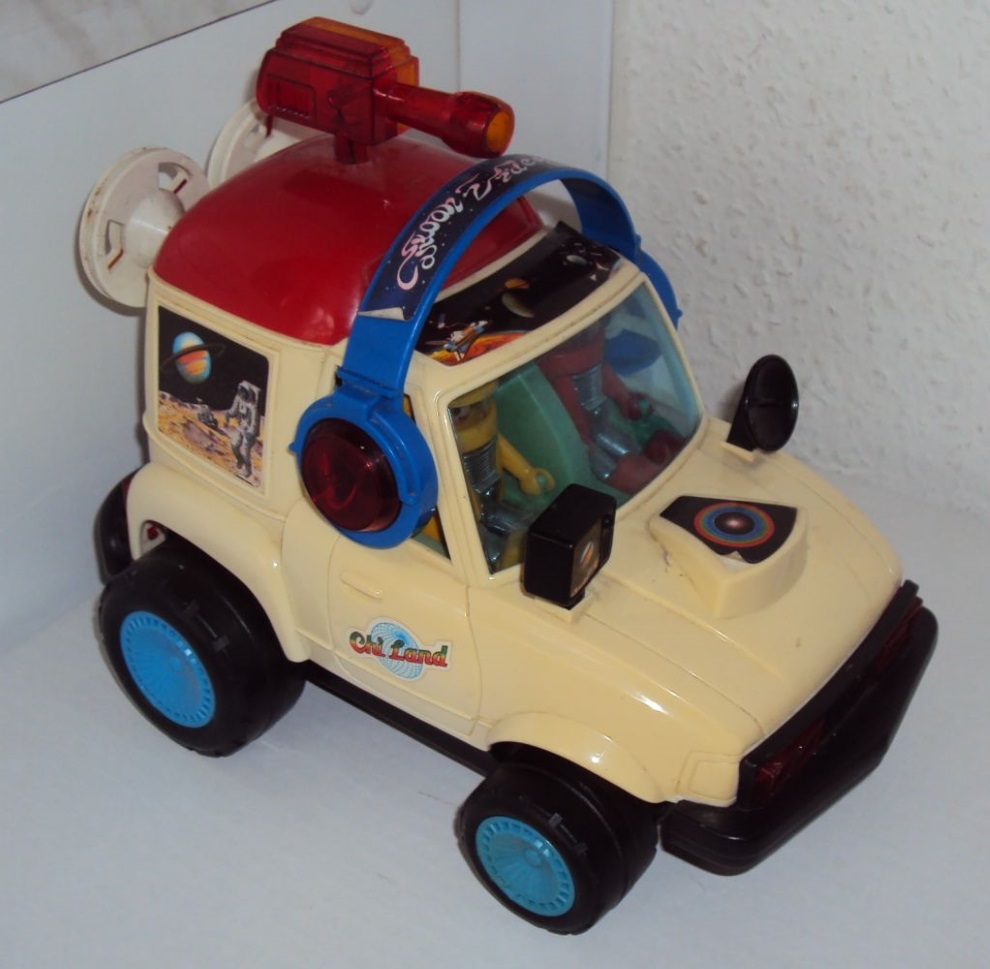 Er hat einen elektrischen Antrieb (siehe Bild) und hat 2 beleuchtete Lampen auf dem Dach und eine im vorderen Bereich.