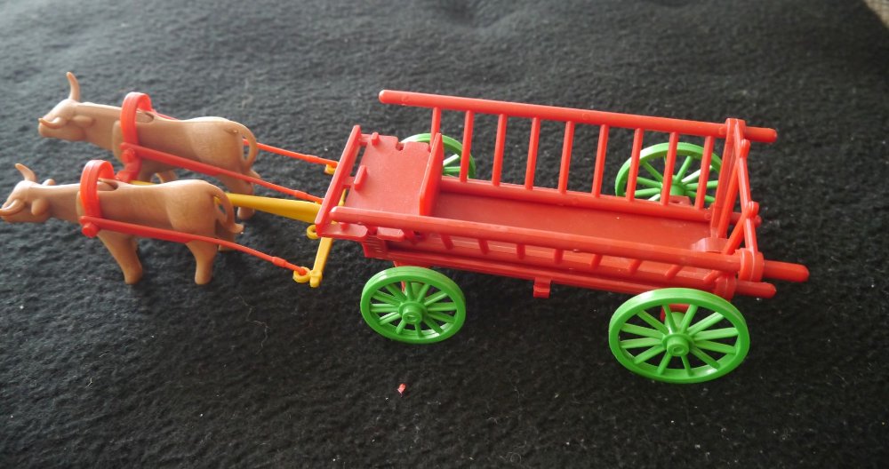 . Hier wird er von einer PM Kuh und einem PM Ochs gezogen, was ich ganz passend finde, aber ich sollte wohl echte Schenk-Pferde vorspannen