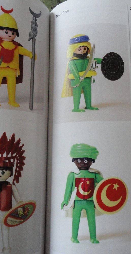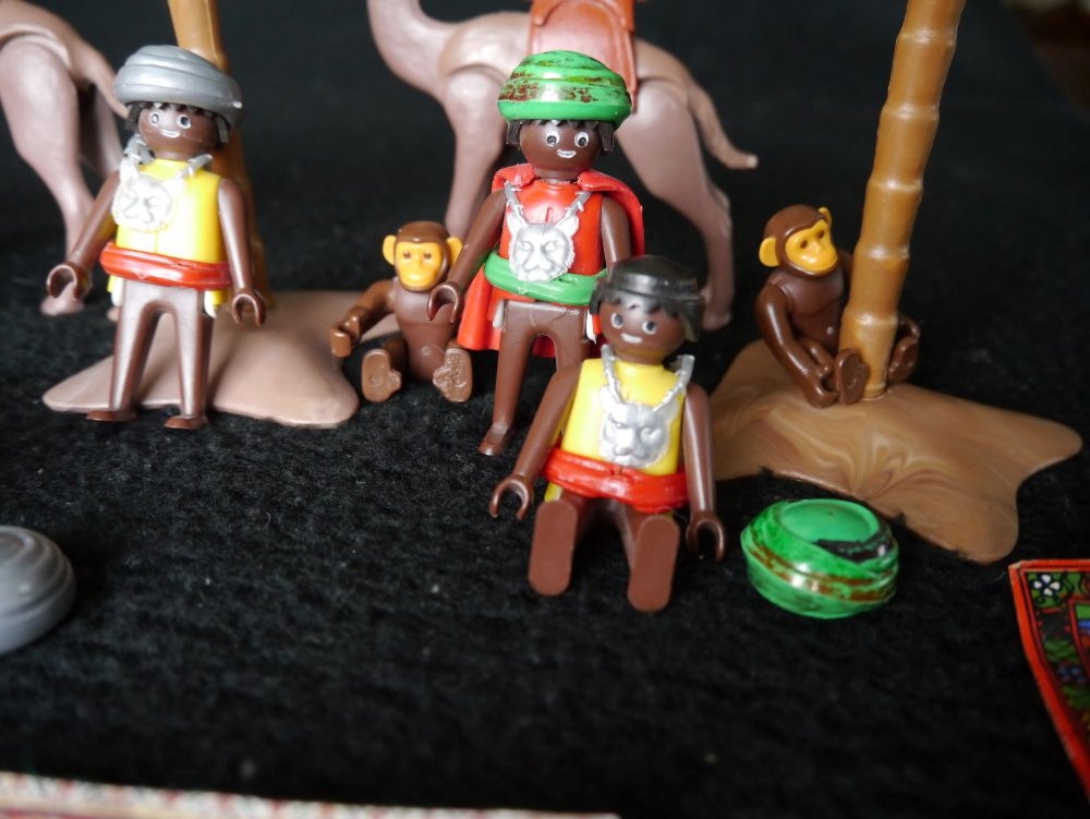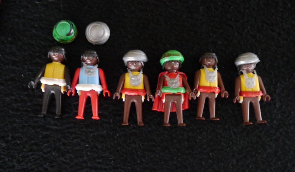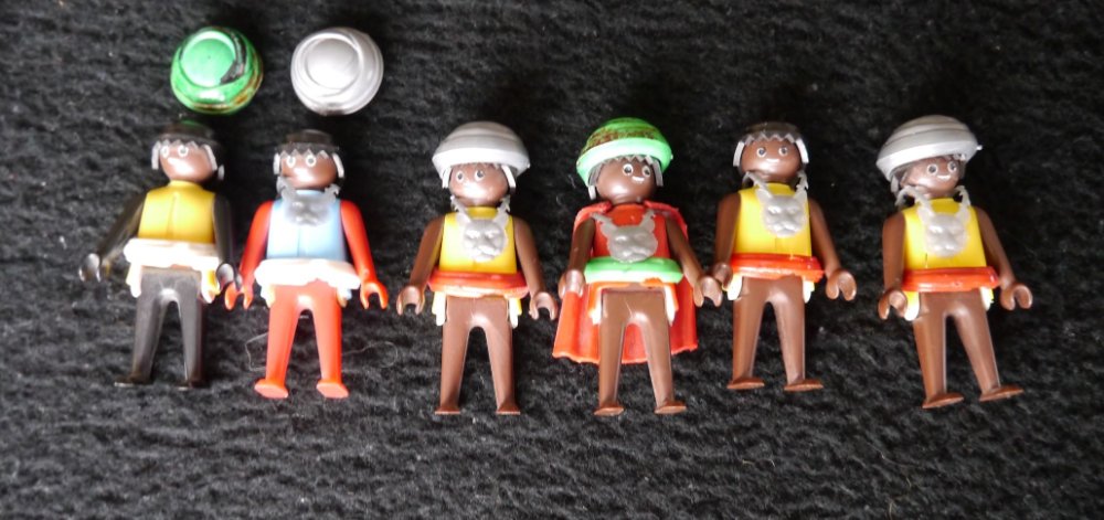 An Figuren habe ich sechs Stück. Vier davon haben braune Körper und je eine schwarz und rot. Ich vermute, dass 5 davon von einer Fünferpackung stammen, wo meist eine Figur anders war als die anderen. Die Köpfe sind alle schwarz. Leider fehlt ein Turban und zwei der vorhandenen Turbane passen überhaupt nicht auf den Köpfen. Ist das normal für Schenk?