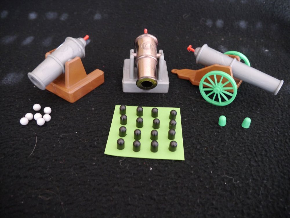 Zwei davon haben das Rabenemblem, gehören also zu den Hunyadi-Rittern. Die dritte ist die mit den grünen Rädern, als Emblem hat sie einen türkischen Halbmond. Ich habe das Munition so "verteilt", wie es mir logisch erscheint, das ist aber möglicherweise falsch. Der Mechanismus funktioniert nicht bei der türkischen Kanone (könnte ein geschickter Bastler vielleicht reparieren).