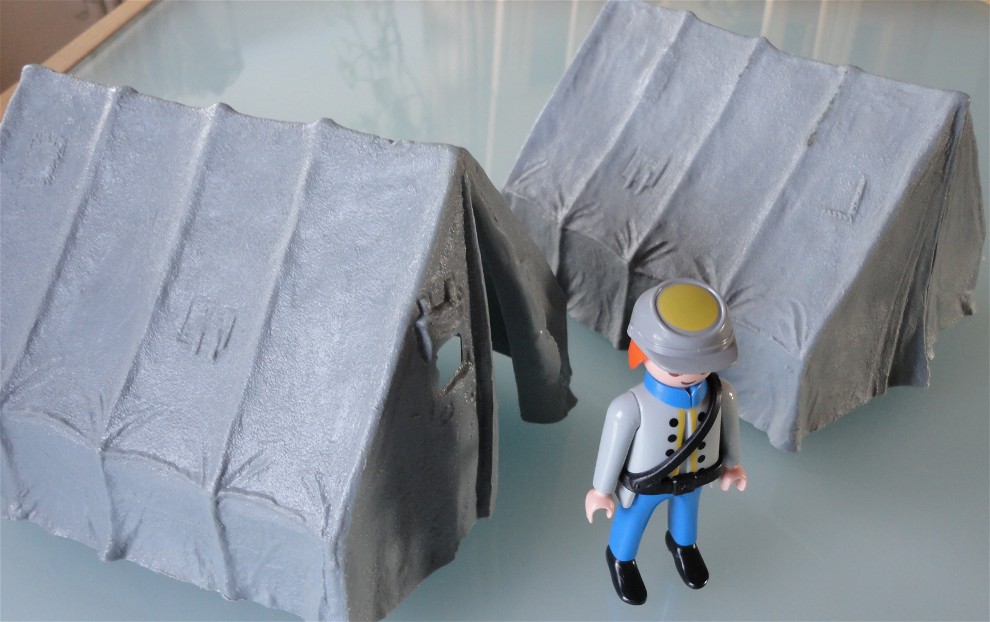 ich war heute mal wieder auf einem Flohmarkt und habe zwei Zelte gefunden, die von der Größe her ganz gut zu Playmobil passen.