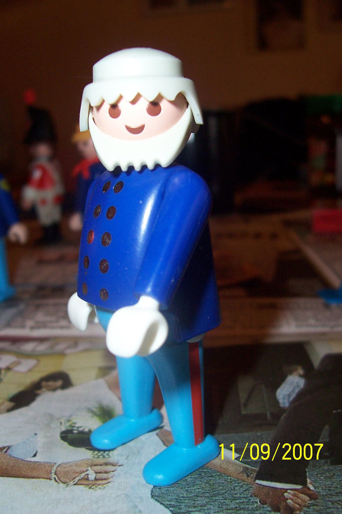 ein dicker älterer Mann mit dunkelblauem Oberkörper,Knöpfen auf der Jacke und einer hellblauen Hose mit rotem Streifen an der Seite---vermutlich ein Nordstaatler--aber welcher/woher?---Sorry aber leider hab ich keine Batterien mehr hier für die Kamera...aber vielleicht könnt ihr mir ja auch so helfen--Bild reiche ich dann morgen nach.