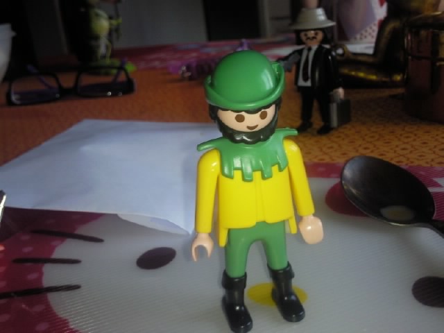 Dem fehlt noch eine rote Feder am Hut, ein schwarzer Gürtel mit Noppen für den Köcher, ein dunkelbrauner Köcher mit Pfeilen und der hellbraune Schutz am Arm (für Bogenschützen).
