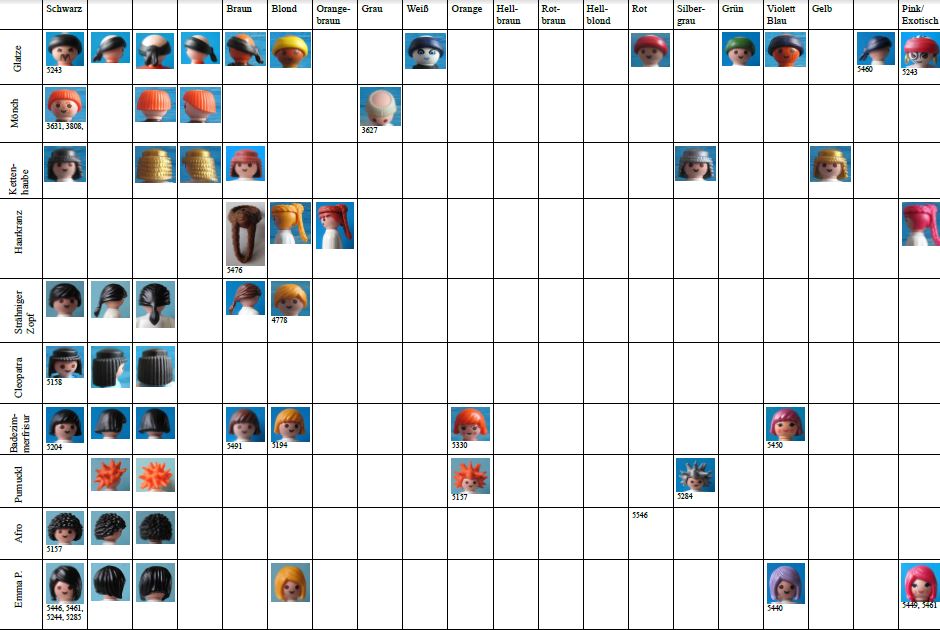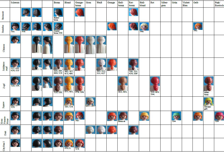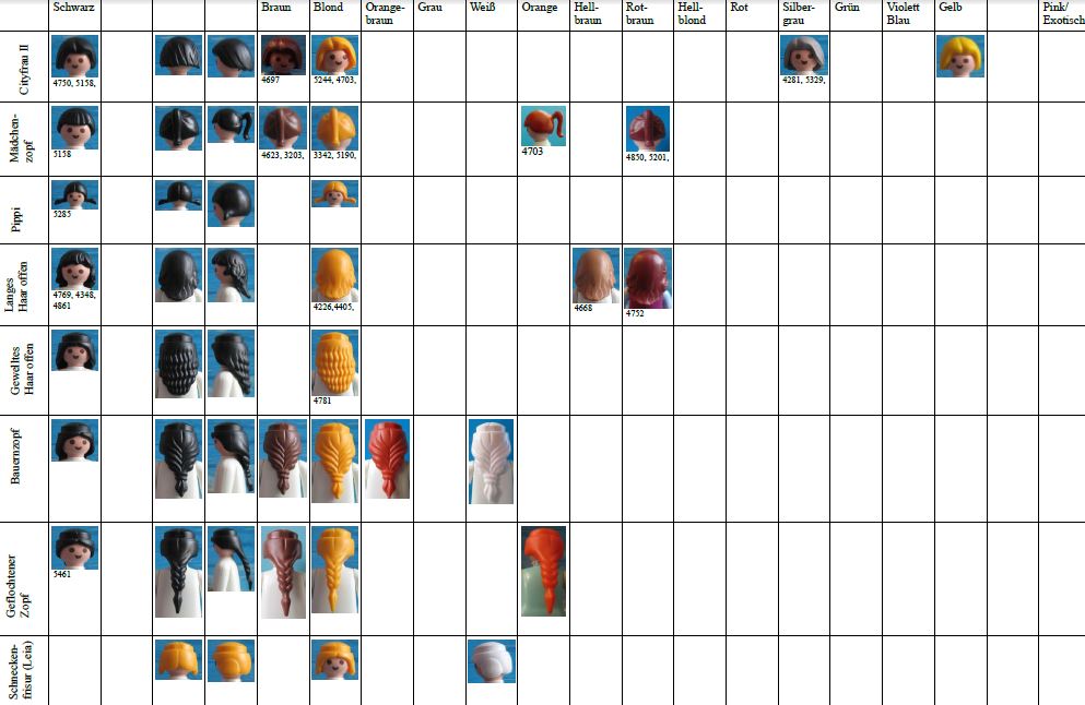 Letztes Jahr begann ich einen Katalog von Haar-Typen, mit Informationen und Bilder aus http://www.playmodb.org. Es ist nicht so gut organisiert wie Ihr Katalog, noch als komplett! Veröffentlichte ich mein Versuch auf der englischsprachigen Playmofriends Forum. Es beinhaltet alle bekannten Teilenummern für Haarteile und (für alle außer den häufigsten Typen) eine Liste von Satz-Nummern, wo das Haar Typ gefunden werden konnte. Obwohl es nicht mehr aktuell ist, können Sie es hier sehen, wie ein MS Excel-Datei: https://dl.dropbox.com/u/61286767/Playm ... 0types.xls oder hier als pdf: https://dl.dropbox.com/u/61286767/Playm ... 0types.pdf