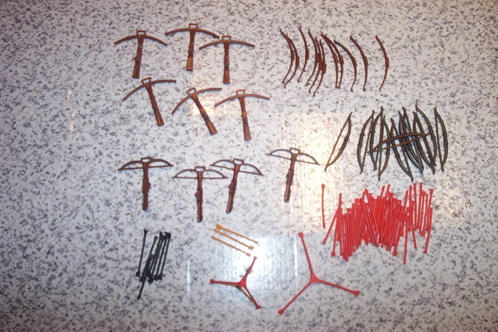 @ Raubritter: Früher wurden die Armbrüste noch mit kleinen Gummis zusammen ausgeliefert. Diese konnte man tatsächlich als Sehne einspannen. Die Bolzen/ Pfeile waren, im Gegensatz zu den heutigen, einzelne. Sie hatten extra an der Rückseite eine Verbreiterung um das Gummi besser ansetzen zu können. Die Pfeile selbst waren orange, so daß man sie leichter wieder gefunden hat.
