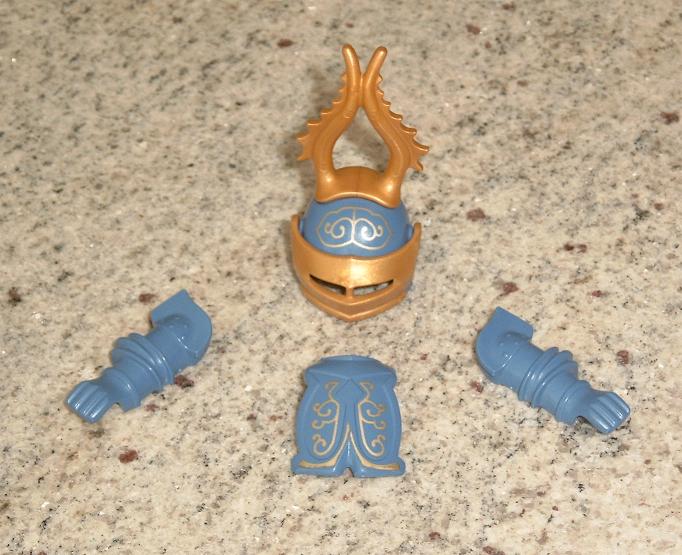 bei einem Lot Ritter, die ich neulich in der "Bucht" geschossen habe, fanden sich dieser blau-goldene Helm und die Rüstungsteile. Es sind offensichtlich keine lackierten Teile, sie sind ganz sauber durchgefärbt. Ziemlich sicher sind sie also schon aus blauem Plastik gespritzt. Helm und Brustharnisch tragen goldene, offensichtlich aufgedruckte Ornamente. Wenn die Teile von einem Custom stammen, ist es verdammt gut gemacht.