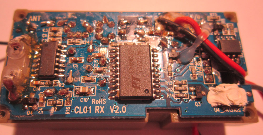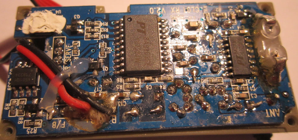 Jetzt habe ich die Empfängereinheit aufgeschraubt und bin entsetzt. Die Platine ist in einem misserablen Zustand. Dabei lag sie nur in eine trockenen Kellerschrank und war von außen in einem einwandfreien Zustand. Das sieht doch nicht normal aus, oder?