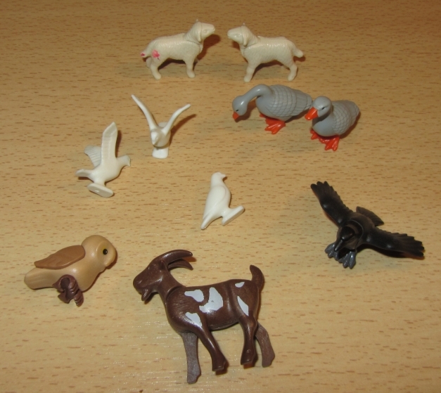 Tiere gab und gibt es in sehr vielen Sets. Naturgemäß vor allem bei den Themen Bauernhof, Outdoor usw. Speziell die Tauben und die schwarze Krähe sind in extrem vielen Sets zu finden.