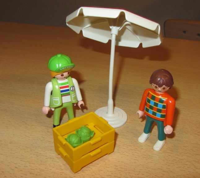 die Figuren auf dem ersten Bild kommen aus dem Set 3202 (Obst- und Gemüsestand) - allerdings trägt die eine Figur dort eine andere Mütze.