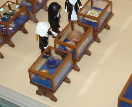 Die Vitrinen sind übringens Schmuckkästchen mit braunem Isolierband. Dazu Playmo-Holztische in groß und klein und blaues Samtpapier als Unterlage.