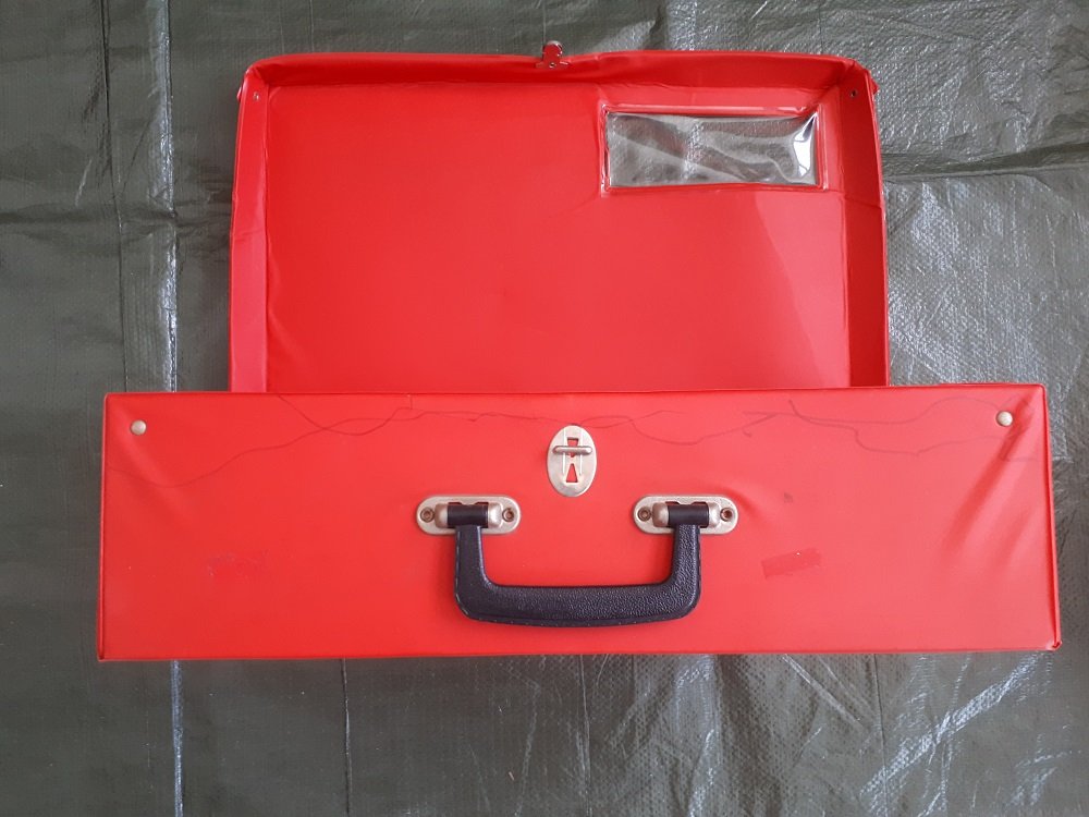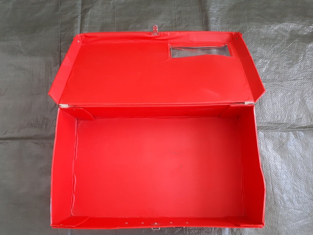 Der Koffer besteht aus einem Pappkarton-Kern, beschichtet mit roter Folie.