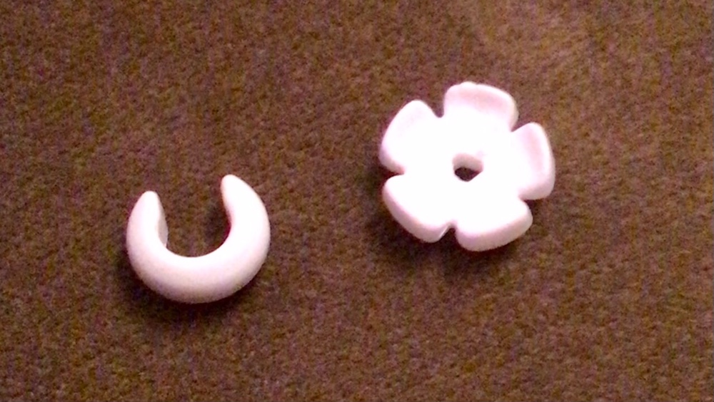 In einem Konvolut war dieses kleine weiße Teil dabei. Es geht um das halbrunde Teilchen, die Blüte habe ich nur zum Vergleich daneben gelegt. Es passt an keinen Arm, ist also keine Manschette. Ich habe schon versucht, in der Playmodb zu suchen, aber da ich nicht mal weiß, wonach ich suchen soll, komme ich da nicht weiter …
