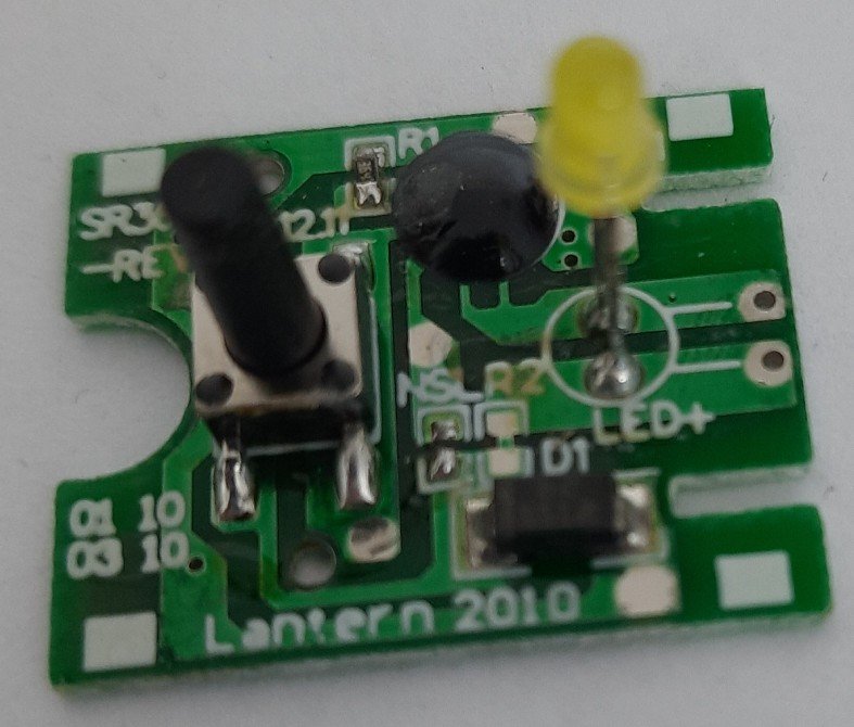 Hallo. Ich konnte heute einen Blick darauf werfen. Wie Sie sehen können, verwendet die Platine einen integrierten Schaltkreis, der unter einem Klecks Epoxidharz verborgen ist, sodass es nicht einfach ist, das Verhalten zu ändern. Ich bezweifle, dass das Entfernen oder Ändern der Werte des Widerstands und/oder Kondensators die Funktion auf „Immer eingeschaltet“ ändert, aber Sie könnten es versuchen. Ansonsten könnten Sie den Stromkreis so umverdrahten, dass die LED über einen Widerstand mit dem entsprechenden Wert mit der Batterie verbunden ist. Der Knopf hätte keine Wirkung, Sie müssten ihn öffnen, um ihn auszuschalten. Eine heikle Änderung, aber sie würde das tun, was Sie brauchen.
