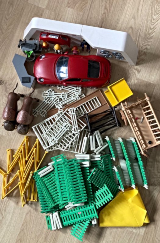 Dann später ein weiteres. Während ich mich nach dem Preis erkundigte (ebenfalls 1,-), stürzten sich zwei andere auf das restliche Playmobil und konnten mehrere größere Fahrzeuge und ein mittelalterliches Haus für jeweils 5,- mitnehmen. Ich griff mir in dem Getümmel noch die erstbeste Tüte quasi wie ein Blind Bag für einen 5er. War später beim Sichten sehr zufrieden, weil ich sowieso noch Gartenzäune suchte.