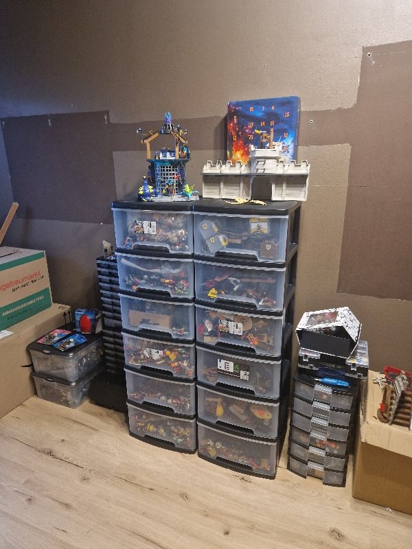 Diese schwarzen Regale sind so stapelbare Sortierlösungen von Action, die großen gibt's gerade um ca. 15,- (3x Box), sind für Playmobil eigentlich perfekt. Aber nicht überanspruchen !