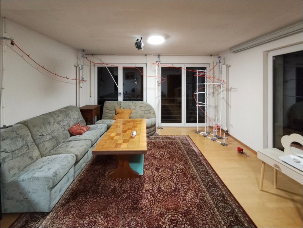 Da die Kinder nur noch sporadisch damit gespielt haben und vor allem weil es mitten im Weg stand habe ich den Rundkurs abgebaut und eine normale Strecke gemacht, über 15m lang und entlang der Wand, inkl. Heizkörper, Gardinenstange und Sofa...