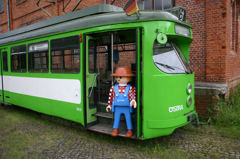 Großfigur beim Erkunden des Straßenbahn-Museums in Wehmingen