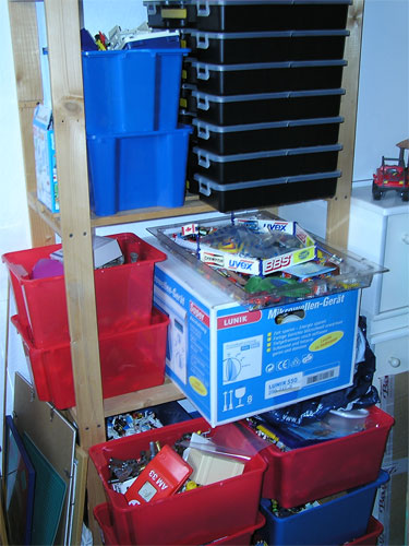 Das ist bei mir etwas anders. Auf dem Bild sind etwa 20% meiner Sammlung an losen Teilen. Ich habe in diesen Kisten (IKEA) mal Pinsel und Palette des Osterhasen gesucht. Gefunden nach gestoppten 87 Sekunden... :smile