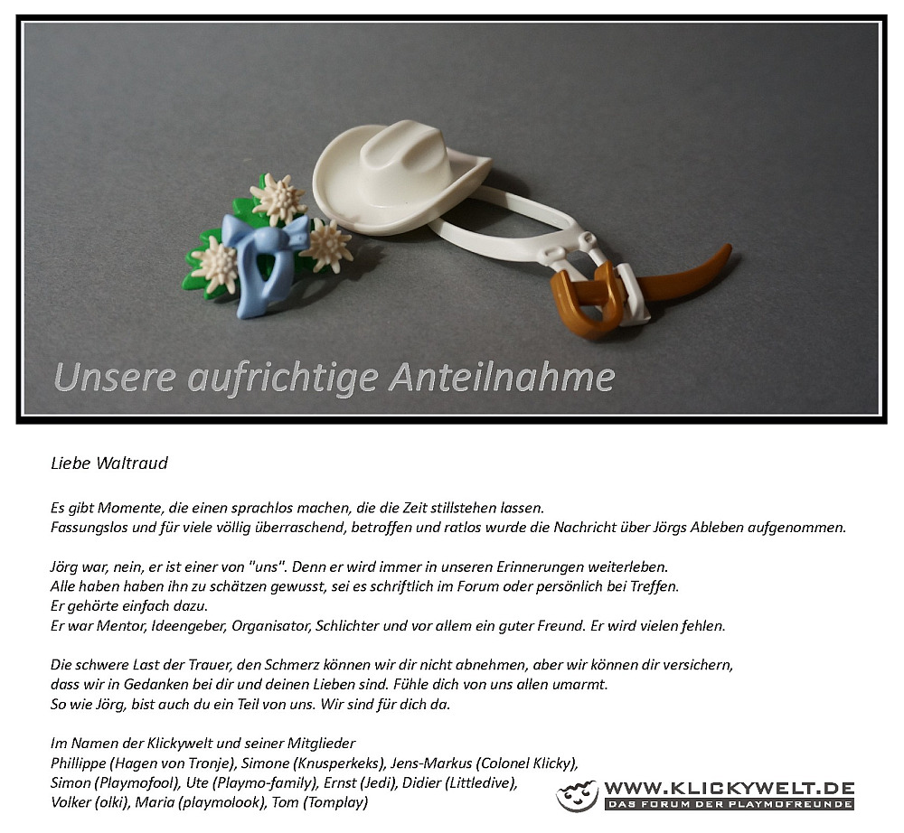 Sein Ableben ist ein unendlich großer, schmerzhafter und tragischer Verlust, natürlich in erster Linie für seine Familie. Aber auch hier im Forum und in der Playmobilgemeinde hinterlässt er eine große Lücke.