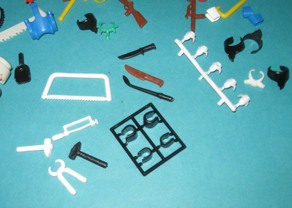 Die vier weissen (!) Werkzeuge sind nicht von Playmobil (ich vermute Play Big). Der Rest ist alles PM. Die schwarzen Manschetten (je zwei für die Arme und zwei für die Beine) am Gussrahmen gehören zum Fischer, bzw. zur Besatzung der Susanne.