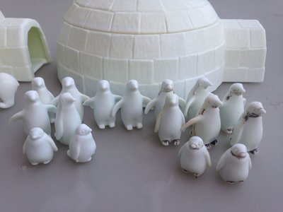 Was noch in der Bleiche mit drinnen war und was ich aber vorher nicht abgelichtet habe, sind einige Pinguine und zwar weiße unbemalte und mit Colorstiften bemalte. Davon habe ich nur Nachher-Fotos. Allerdings kann ich hier die Info geben, dass ziemlich viel Farbe abgegangen ist, denn die waren ordentlich mit Schwarz "beschmiert".