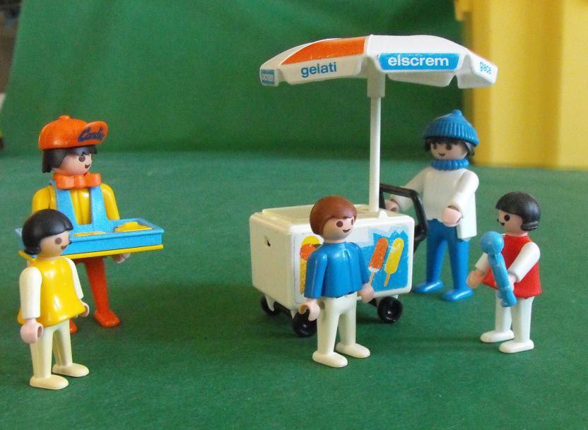 Bauchladen und kleiner Eiswagen.