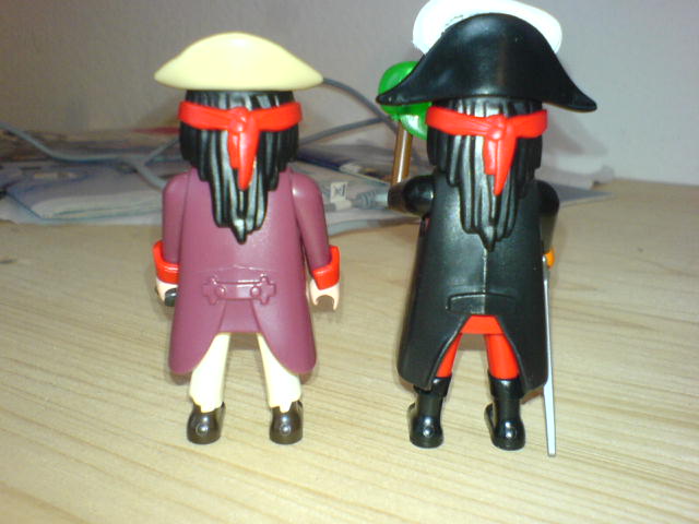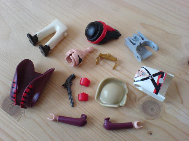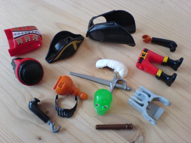 Den Piraten habe ich damals an seinem Mantel erkannt und an dem Totenkopf (Teil in Kopfgröße aber ohne Hals). Arm mit Hakenhand ebenfalls möglich. Den Mantel hatte aber auch der irre Gitarrist, und ich auf einmal eine Figure zu viel