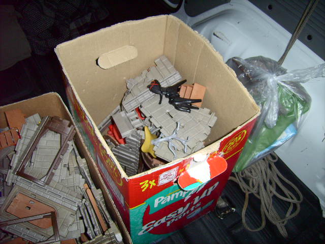 Insgesamt hab ich mein Budget gesprengt, anderseits kann ich nichts liegenlassen, wenn der Preis stimmt und etwas ärgere ich mich schon, dass ich nÃcht ALLES gekauft habe. "Packt mal alles ein, ich geh zur derweil Bank..." Von fünf Burgen-Kartons hab ich nur drei mitgenommen und es tat mir in der Seele weh, wie die Turniertribüne mit drei Männeken für 5 Euro den Besitzer wechselte. Aber ich hab schon drei davon. Oder vier? Ganz unten im Burgenkarton glaub ich, die OVP zum Turnier gesehen zu haben. Hatte aber noch nicht den Platz, alles auszukippen.