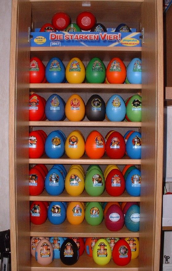 Da ich von den Eiern nur diejenigen sammle*, deren Inhalt mir gefällt, habe ich halt eher ein kleines Häuflein von Einzelstücken im Schrank, die dazu tendieren wild durcheinander zu kullern, sobald man sie nur ein wenig zu scharf ansieht... :kicher