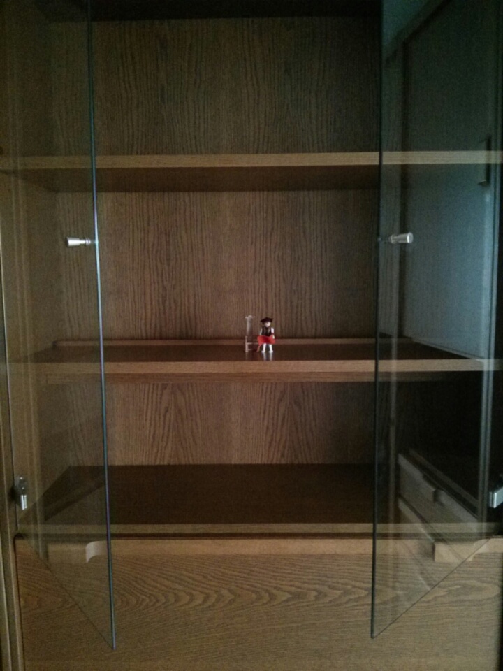 Leider durfte mein Playmobil nicht die ganze Vitrine bevölkern. Meine Frau wollte für ihre Häkelsachen auch noch Platz. Obwohl die doch ihr eigenes Bastelzimmer hat.