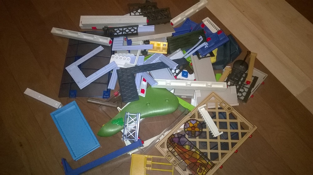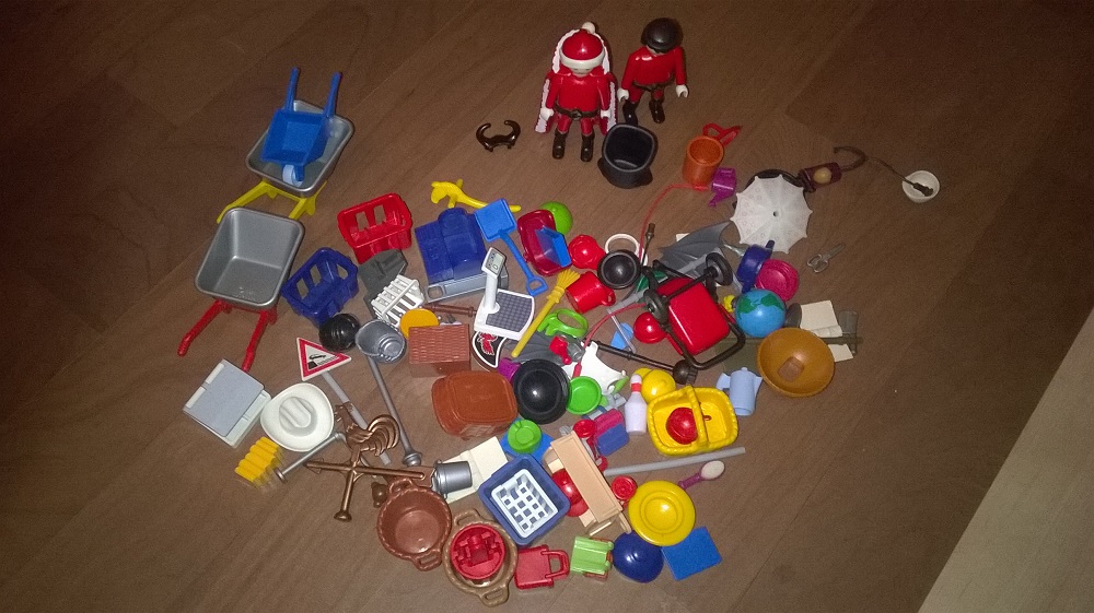 Bis Dezember möchte ich ein Puppenhaus (ok, die Idee geht in Richtung Mehrfamilien-Puppenhaus) für meine Püppi fertig haben und nutzte die Gunst der Stunde, ein "Restekonvolut" für 30€ zu kaufen. Und es war wirklich alles zu finden: Teile vom Krankenhaus, Schule, Zoo, Adventskalendern, dem Toskana-Ferienhaus und den Nostalgie-Häusern; Wahrscheinlich ist noch mehr zusammengeramscht, ich habe halt nur nicht die Zeit mir jedes einzelne Teil mit der PlaymoDB anzuschauen.